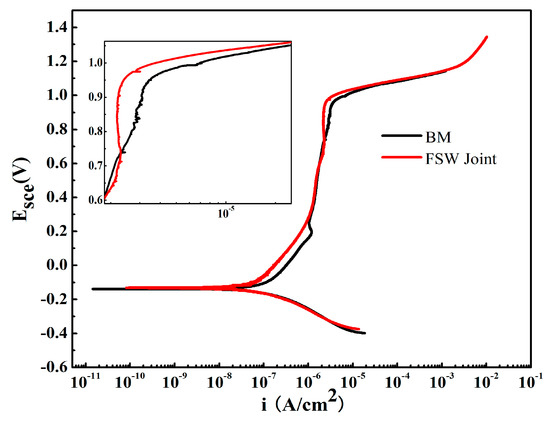 The effect of FSW on corrosion resistance of the SZ was investigated in a 3.5% NaCl solution at 25 °C ± 1 °C (Figure 13). The polarization curves of the BM and the SZ appear to have similar shapes and contain a wide passive region around 1.2 V. The pitting potentials of the BM and the SZ are 0.95 and 0.98 Vsce, respectively. The difference in corrosion resistance between the pitting potential (Epit) and passive current density (ipass) is positive. That is, the SZ displays a greater corrosion resistance than the BM. In addition, the magnitude of variation in corrosion potential (Ecorr) corresponds to the pitting potential. Along with the mechanism of the FSW, fine grains are generated in the SZ. A large number of grain boundaries exhibit active positions susceptible to corrosion. They also supply ionic conduction channels contributing to anodic reactions. Ralston [36] has demonstrated that materials with fine grain structures are expected to be more corrosion resistant. The improved corrosion resistance can be attributed to the fine grains in the SZ; that is, an increase in the grain boundary density surface acting as diffusion paths of atoms facilitates passive film growth. Similar results have been reported [20,37]. As reported by LvJinlong [37], fine grains strengthen the stability and uniformity and improve the corrosion resistance of passive films of 2205 duplex stainless steels. Another study has demonstrated that the fine grains achieved by FSW increases the corrosion resistance of DSSs [20].