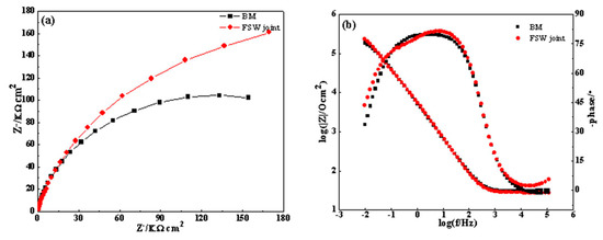 The electrochemical properties of the passive film were evaluated via EIS, a technique for accessing relaxation phenomena. Figure 14a shows the typical Nyquist plots of base and weld metals in 3.5% NaCl. Two successive depressed semicircles appear in the Nyquist plot. The diameter of the capacitive semicircle in the Nyquist diagrams is correlated with corrosion resistance. Thus, the numerical size of the charge transfer resistance of the passive film is reflected [38]. The weldment has a larger impedance diameter than the BM, indicating superior corrosion resistance of the former. Figure 14b shows the corresponding Bode plots of the BM and the SZ. Two well-defined time constants are observed in the two Bode-phase formats. This observation indicates that a passive film has formed on the 2707 HDSS surface and it consists of a bilayer structure. As reported [37,38], a passive film, including its active or passive region, cannot be ideally homogeneous.