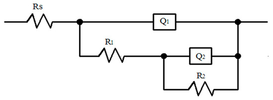 An equivalent circuit (EC) has been proposed to be used to interpret the interface phenomenon between an electrode and a sample [37,38,39]. The maximal phase angle value in both Bode-phase plots is lower than 90°. Such behavior can be attributed to the deviation from the ideal capacitor behavior. Therefore, constant phase elements (CPEs) instead of a pure capacitance are used in EC to describe the frequency-independent phase shift betweenalternating potential and its current response. The corresponding impedance of a CPE is defined by the expression ZCPE = Z0(jw)n. n, which is a CPE exponent, describes the deviation from the ideal capacitance. When n = 1, the CPE represents an ideal capacitance. For 0.5 < n < 1, n decreases with the increase in capacitance dispersion. When n = 0.5, the CPE symbolizes a Warburg impedance characteristic of diffusion.
