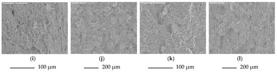 Fractures of the specimens of martensitic steel for both longitudinal and perpendicular directions are shown in Figure 2i–l. Side zones, as well as small zones under the notch, are plastic fractures with voids of various diameters, see Figure 2i. Brittle non-metallic inclusions that initiated the fracture occur within larger voids. Pits have parabolic shapes, which evidences action of tangential forces during cracking. The central zone is the so-called quasi-cleavage fracture (Figure 2j,k). This is typical for steels with martensitic and bainitic structures. Even though these facets are similar to cleavage facets (because of occurrence of the “river” profile), it is almost impossible to identify crystallographic planes. Ridges of quasi-cleavage facets are characterized by developed topography, which also evidences intensive plastic deformation during their creation. Moreover, numerous transverse cracks and cavities left by non-metallic inclusions were observed, see Figure 2k,l.