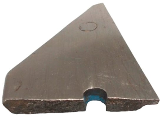 During tillage, one of the parts was broken: a share-point made of pearlitic steel broke across, in the line running through the lower assembly hole, see Figure 4. After the tests, almost all share-points made of pearlitic steel were somewhat bent, see Figure 5. Looking in the direction of their movement in soil, the share-points were bent “forward” or “backward”. The bends were small and did not exclude the share-points from further operation. It is probable that the “backward” bends were caused by collisions of the shares with stones occurring in soil. The “forward” bends could also result from collisions with stones (at the reaction force directed upwards) or by hitting against the ground on the headlands. A consequence of “forward” bending of the share–points was the necessity to replace them somewhat earlier, because the lower fitting bolts and nuts were uncovered and subjected to abrasive wear. Bending of the trapezoidal parts (Figure 5) was observed on five examined shares but, principally, at the end of their service life, when their thickness was significantly reduced as a result of abrasive wear. Therefore, in the test conditions, bending of the parts made of pearlitic steel was a typical phenomenon.