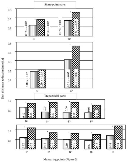 Unit thickness reduction of the parts was greater in the places located in the lower measuring line (measuring points from g3 to g9). The share-points were subjected to the most intensive wear in the area adjacent to the field edge and the nearest to the blade (measuring point g4), which can be related to the highest pressure exerted by the soil on that surface fragment. In the case of the trapezoidal parts, these areas were extreme measuring points located at the lower measuring line (measuring points g5 and g9).