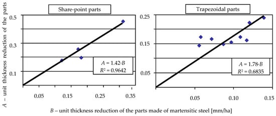 Relation between unit thickness reduction of the parts made of pearlitic and of martensitic steel (R2—coefficient of determination).