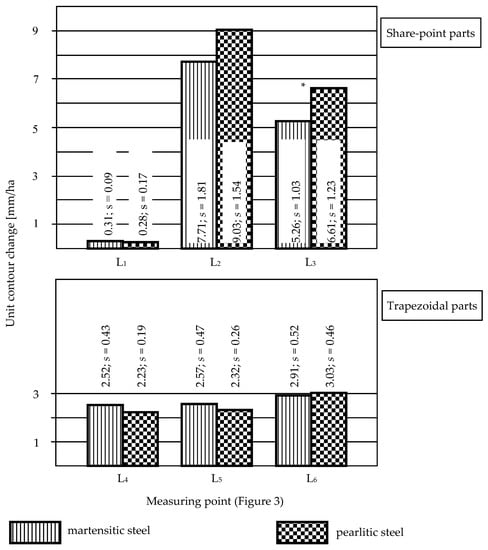 Unit contour change of share-points and trapezoidal parts of the examined ploughshares (s—standard deviation, *—statistically significant differences).
