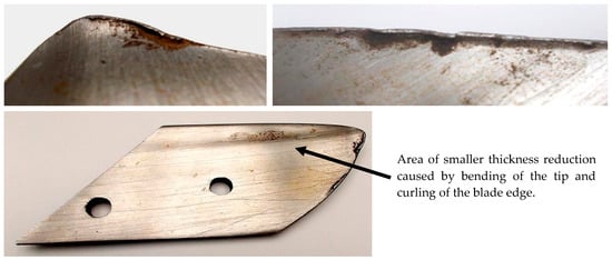 In some share-points made of pearlitic steel, a bending of their tips on a small length and a curling of the blade edges were observed, see Figure 13. These phenomena contributed to more irregular thickness reduction of the parts. Bending the share-points “forward” facilitated the a.m. processes because of the smaller thickness of the parts in their blade areas.