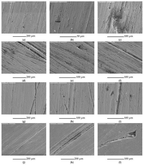 Analysis of the wear surface of a share-point made of pearlitic steel shows rough surface topography due to microcutting and microploughing caused by abrasive particles. The scratches and grooves are wide, deep, and randomly orientated, see Figure 15a. There are also visible scratches and scrapes randomly orientated. Moreover, some traces of spalling and pitting, originating in the places where larger areas of material were removed (Figure 15b), were observed at the surfaces. An examination of some pit holes showed the plastic deformation and displacement of material from the impact sites to the crater rims. These phenomena caused formation of grooves with pronounced lips at their rear ends. Abrasive particles could also cause surface fatigue. In these lips, detachment could occur due to these particles. In some pit holes, fragments of embedded abrasive particles are visible (Figure 15c). It can be seen on a surface of a trapezoidal part made of pearlitic steel that the proportion of microploughing increases (Figure 15d–f). The other observation on the surfaces of a share-point (Figure 15g–i) and a trapezoidal part (Figure 15j–l) made of martensitic steel is that scratches and grooves are arranged parallel to the movement direction of abrasive particles along the surface. The grooves are relatively narrow and shallow, but some areas are visible, where scratches and grooves are more concentrated (Figure 15k). Some shallow, randomly orientated scratches can be observed. Grooves formed by moving soil particles and plastically deformed material are visible on the crater rims, see Figure 15i,l.