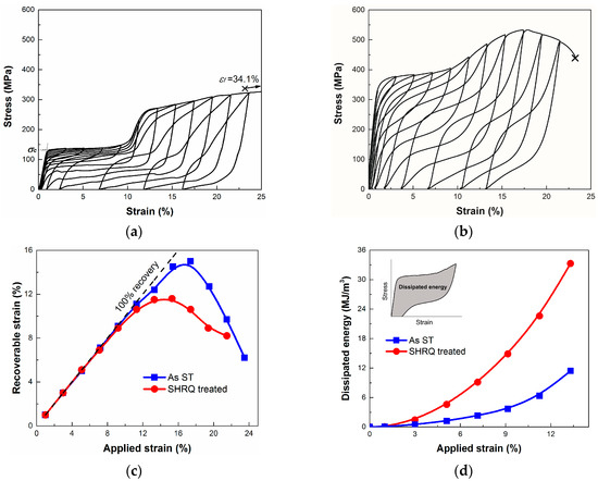 Cyclic tensile stress–strain curves obtained in the (a) as-solution-treated (as-ST) sample and (b) SHRQ-treated sample at room temperature. (c) Recoverable strain as a function of applied tensile strain. (d) Mechanical energy dissipated by one superelastic cycle as a function of applied tensile strain for both samples.