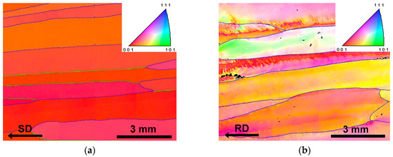 As described previously, the superelastic strain of the Cu–Al–Mn SMAs has a strong dependence on microstructure [4,5]. The strong <001> texture and straight grain morphology are the key factors making columnar-grained Cu–Al–Mn alloy show a high recoverable strain [6]. Figure 3a, Figure 4a show the EBSD map and corresponding inverse pole figure of the as-ST sample. It shows a strong <001> texture and straight grain boundaries along the SD, which are typical characteristics of columnar-grained microstructure, and the grain orientations perpendicular to the SD are distributed randomly between <001> and <101> [6]. After SHRQ treatment, even though there was a little loss of orientation uniformity within each separated grain, the <001> texture along the RD was retained, and no recrystallized grain was observed, with the grains in a columnar morphology, as shown in Figure 3b, Figure 4b. The theoretically calculated maximum superelastic strain caused by reversible β1/6 M martensitic transformation with stressing along different grain orientations is drawn as contour lines in the inverse pole figure in Figure 3c, Figure 4b [9]. It can be seen that the corresponding theoretical superelastic strain is basically larger than 9% in the SHRQ-treated sample. Therefore, the maintaining of a high recoverable strain in the SHRQ-treated sample is ascribed to the retained <001> texture and columnar grain morphology.