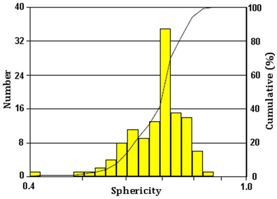 Shape parameters such as sphericity and size distribution for each size fraction of particles were obtained by means of an optical microscope integrated with Clemex software (Longueuil, QC, Canada). Sphericity of the particles of each size fraction was also analyzed by means of image analysis. As an instance, the distribution of sphericity for the particles of a −4+8 mesh has been shown in Figure 2. All of these variables were considered in creating numerical models.