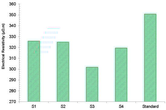 A standard industrial aggregate mix has an electrical resistivity of 350 μΩ·m. As presented in Figure 3, all other samples have electrical resistivities that are lower than the standard sample. The sample with the lowest electrical resistivity is S3 with 301.8 μΩ·m. This represents a 13.8% reduction in electrical resistivity. Eidem et al. [] have already shown that, in mono-size mixes, as the size of particles increases, the bulk electrical resistivity decreases. It is believed that the electrical resistance of a bed of particles is the sum of the resistance of the material and the resistance of contacts. Thus, when the particles are coarse, the number of contacts as well as the resistance of each contact is much lower compared to a bed of fine particles. However, the case of particle assemblies with irregular shapes and multi-size fractions is complicated. The DEM is used in this work as a powerful tool to evaluate the contact information in different samples and to reveal its effects on the electrical resistivity of the particle bed. It is, however, worth emphasizing that particle–particle contacts in DEM models are influenced by size distribution and the shape of particles, the mechanical properties used in the models, the number of spherical elements used to model each particle, and finally the precision of the imaging technique. The contact information of real-world particles cannot be measured. Thus, inter-particle contact data presented here, which comes from numerical models, cannot be verified directly. However, all efforts have been attempted to obtain the best particle modeling and thus the most realistic contacts.