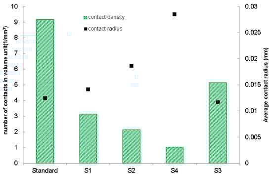 In Figure 4, the average contact radius and the number of contacts in the volume unit (mm3) of aggregate mixes are compared. As the content of coarse particles (the −4+8 mesh) in the standard sample is 33.6% and, in all other samples, 60% or more, there is a remarkable distinction between the standard sample and the modified ones. The standard sample has a very high contact density of 9.16 mm−3.