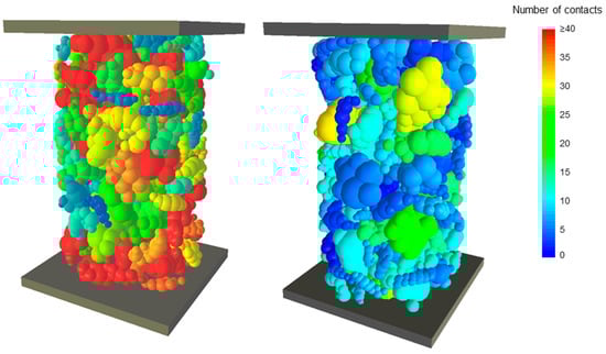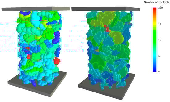 However, if contacts between only the coarse particles in these samples are plotted, the difference is not considerable. This has been presented in Figure 6, where again only coarse particles are shown and where the color index shows the number of contacts between −4+8 particles.