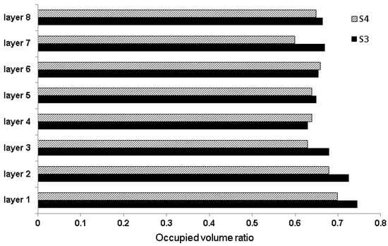 The packing density in eight horizontal layers in Samples S3 and S4. A higher occupied volume means a greater area for current transfer.
