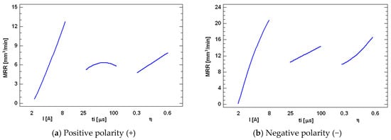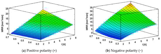 Figure 2 represents, for both polarities, the estimated response surface of MRR versus current intensity and duty cycle, while pulse time remains constant at its central value. As can be observed in Figure 2a, there is a tendency for MRR to increase for high values of current intensity (5 A–8 A) as a function of duty cycle. However, when low values of current intensity are selected (2 A–3 A), the tendency is the opposite. In the case of negative polarity, as shown in Figure 2b, at low values of current intensity (2 A), MRR tends to slightly decrease if duty cycle increases up to a minimum, situated approximately at 0.5, after which it starts to increase. Moreover, as previously mentioned, in both cases, the highest values of MRR are reached when both current intensity and duty cycle are maximum (8 A and 0.6).