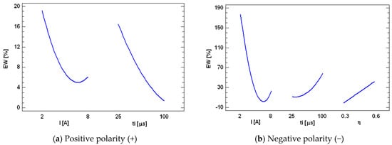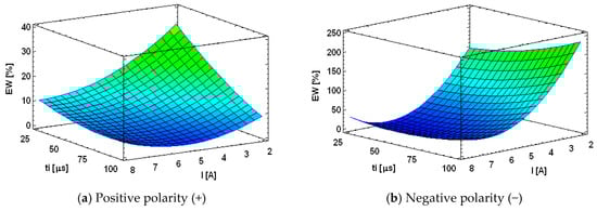 Figure 4 represents, for both polarities, the estimated response surface of EW as a function of the two factors, current intensity and pulse time, while duty cycle remains constant at its central value. As can be observed in Figure 4a, the highest values of EW are reached with the lowest values of both, current intensity and pulse time (2 A and 25 µs). However, with negative polarity, the maximum EW is obtained by combining low current intensity values and high pulse time values (2 A and 100 µs), as shown Figure 4b.