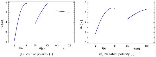 Figure 6 illustrates the estimated response surface of Ra versus current intensity and pulse time. As shown, with both polarities, there is a tendency for Ra to increase as the current intensity is increased up to a point, situated approximately at 5 A, after which it starts to slightly decrease. In addition, this increase is more pronounced at high values of pulse time (100 µs), due to the existence of an interaction effect between current intensity and pulse time.