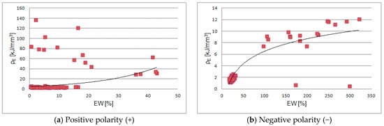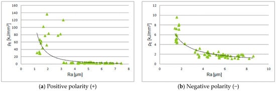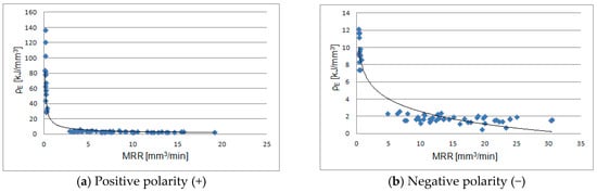 Figure 7 shows the values of ρE depending on MRR and for both polarities. As can be observed, in both cases, the value of ρE tends to decrease significantly with an increase in material removal rate. That is to say, a smaller amount of energy is required when the volume of material removed is greater. With positive polarity, the lowest values of energy density are around 2 kJ/mm3–5 kJ/mm3, and the material removal rates vary from 2.5 mm3/min–18 mm3/min. However, for energy density values between 30 kJ/mm3 and 140 kJ/mm3, the removal rate values drop drastically to values close to 1 mm3/min.