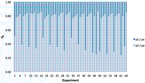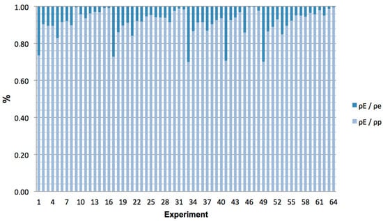 Figure 10 and Figure 11 represent, for each of the experiments and for positive and negative polarities, respectively, the energy density ratio of the workpiece (ρE/ρp) and of the electrode (ρE/ρe). From these figures, it can be clearly appreciated that experiments carried out with negative polarity present a higher energy density ratio in the electrode compared to their counterparts with positive polarity. For example, in the case of E66 (maximum MRR), ρE/ρp was 3.88-times higher with negative polarity than with positive polarity, whereas for E33 (minimum Ra), ρE/ρp was 1.72-times.