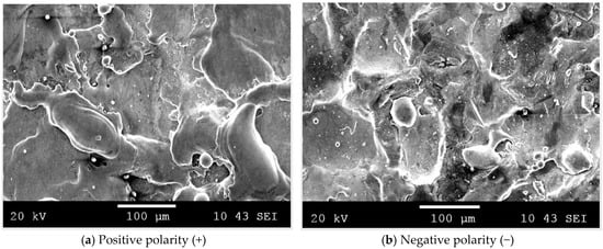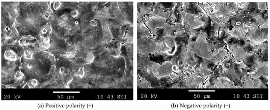 Moreover, Figure 13 shows the EDM’ed surface with the highest values of Ra for both polarities (Ra(a) = 7.41 µm and Ra(b) = 8.33 µm). As shown, with positive polarity, the resulting surface is fairly homogeneous, and the amount of molten material is, in this case, much higher than that obtained for the minimum Ra case. This is because the pulse time has increased to 100 µs, which causes a decrease in the frequency of the pulses and, also, because of the more energetic sparks as a consequence of increasing the current intensity to 8 A. These data are in line with the high material removal rate reached in these experiments: MRR(a) = 10.0405 mm3/min and MRR(b) = 23.8909 mm3/min.