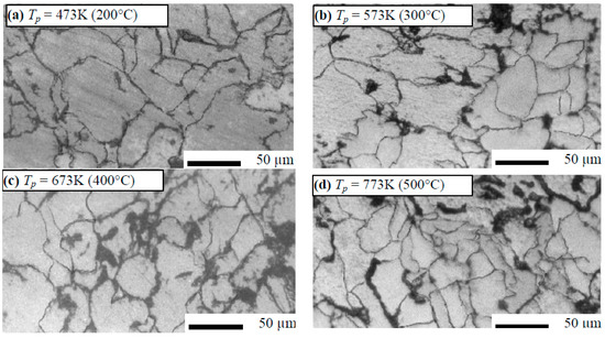 Hot pressing (HP) technique followed by heat treatment was performed to avoid the limitations observed under the cold compaction technique. The Fe–5 wt. % Al and Fe–10 wt. % Al alloys were selected to conduct the hot pressing process. The specimens were pressed at 445.6 MPa, under a pressing temperature ranging from 200 to 500 °C, followed by a heat treatment for one hour duration, at a temperature of 800 °C, going to furnace cooling conditions of 1 °C/min [6]. The temperature was then held at the same level with a tolerance range of ±5 °C. Figure 3 shows the microstructure of the hot pressed Fe–5 wt. % Al alloys samples with various pressing temperatures (TP).
