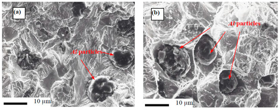 The Al phase was dispersed in many pools or lakes, present in the cylindrical crashed Fe-base alloy samples. The cold pressed Fe–based alloys with the addition of Al were detected to go through fine crystallization, as presented in the SEM in Figure 5a for Fe–5 wt. % Al and Figure 5b for Fe–10 wt. % Al alloys. Fine crystal precipitation in the Fe–Al alloys was detected within vein protrusions, on the surface of compression fracture, and all along the paths of the rough crack propagation; additionally, within shear bands resulting from bending [33].