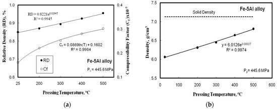 (a) The effect of pressing temperature on the compact relative density (RD) and compressibility factor (Cf); and, (b) the effect of the pressing temperature on the compact density and porosity, for Fe–5 wt. % Al alloys.