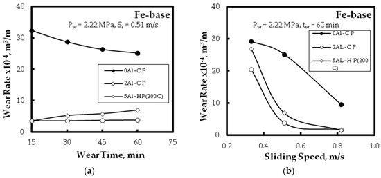 The effect of wear parameter for Fe-base alloys different PM technique on: (a) wear time; and (b) sliding speed for Fe–0 wt. % Al (CP), Fe–2 wt. % Al (CP), and Fe–5 wt. % Al (HP at 200 °C) alloys, respectively.