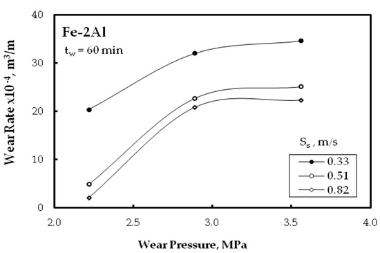 Figure 8 shows the wear behavior of Fe–2 wt. % Al alloy (cold pressing) under different wear pressures. It is clear that increasing the wear pressure resulted in increasing the materials loss, which is a regular known behavior for many metals and all alloys, regarding wear reactions. Hardness plays the predominant role at light wear process, while plasticity has big role at heavy operating conditions [39]. Heat generated due to the friction at high speed affects the microstructure, reduces hardness, and causes thermal stresses in the alloy matrix. As a result, a change in the wear mechanism takes place from abrasive to adhesive wear. Therefore, the worn surface layer is removed and the friction surface is protected from more wear and motion is facilitated, due to the relatively low value of shear strength [40,41].