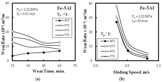 The effect of wear parameters for Fe–5 wt. % Al alloy at different pressing temperature on: (a) wear time; and (b) sliding speed.