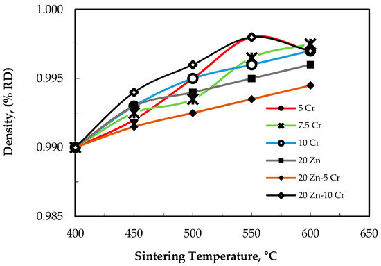 The relative density densification behaviors of the investigated Al-based alloys as affected by sintering temperature for different percentage of Cr and Zn are shown in Figure 1. From Figure 1 it is clear that the relative density increases by increasing the sintering temperature for the aluminum alloy reinforced with different percentages of Cr and Zn. Three classes of mechanisms contribute to densification: plastic yielding, low power creep, and various sorts of diffusion. In the absence of an external pressure, only the diffusion mechanisms exist as sintering is applied. Pore dragging and pore separation from the pores tend to inhabit the diffusion contribution. In order to take the initial pressed density into consideration, the compact sinterability was computed in terms of densification parameter (ΔD) as a proportional function of (sintered − green)/(theoretical − green) densities. The theoretical density was estimated using theory of mixtures [4,7]. Theoretical solid densities, normalized by after extrusion density of all produced parts, are shown in Figure 2. Higher relative densities (RD) were achieved for hot extruding samples to around 99% from the solid density values. Zn particles, having a distinctive lubricating effect, will enhance to a great extent the packing loss of the powders and retard the sealing for the individual pores. Consequently, density will decrease with Zn addition. This may be liquid Zn diffused inside the aluminum matrix and leaves pore inside the matrix. For the Al-based alloys, Cr particles were observed in the microstructure after heat treatment at 500 °C for one hour followed by water quenching. No difference in the microstructures was observed for these alloys that are heated treated at 500 °C for one hour followed by water quenching, as shown in Figure 3. From the microstructures of the heat treated samples, Al-5Cr homogeneous structure was observed at a temperature of 500 °C followed by water quenching. It should be noted that, with the decrease of the aluminum content in the Al-based alloys and the increase of the Cr and Zn content, the density increases accordingly.