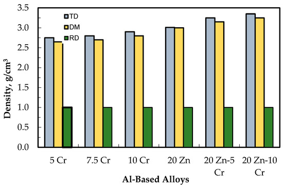 The density of as extruded Al-base alloys (TD theoretical density, DM density measured, and RD relative density).
