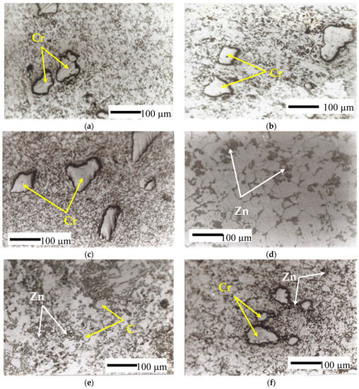 Aluminum chrome matrix composites (ACMC) are used in a wide range of industries including transportation, electronics, leisure, and others [1,2,3,4]. ACMC are usually produced by mechanical alloying of different kinds of metal powders using compression, at a temperature near room temperature, which results in nanocrystalline and supersaturated alloy powders at low temperatures [3]. The large mechanical energies introduced into the powder particles are nanocrystalline interfaces, amorphous state, and promoted reactions between the metals in solid state [5,6,7]. Studies on the trinity Al-Zn-Cr alloys are very limited throughout the literature. Recently, Kurtuldu et al. have investigated the effect of trace addition on the aging behavior of aluminum alloys containing Cr; moreover, the effect of Cr addition on Zn diffusions in molten of Al-Zn-Cr alloys [8,9]. It has been a subject of interest that minor and trace additives have a noticeable effect on these alloys, as far as structure and tensile properties are concerned [10]. In view of the outstanding corrosion and oxidation resistance, the strengthening and toughening of these alloys have been of recent concern [7,8,9,10,11]. Running experiments on the Al-Cr-Zn system at 600 °C, eleven three-phase regions had been identified [12]. Li et al. studied the effect of grain structure on quench sensitivity of an Al-Zn-Mg-Cu-Cr alloy. The results showed that the decrease of the quenching rate from 960 °C/s to 2 °C/s revealed a decrease in the hardness after aging, for the homogenized and solution heat treated alloy with large equiaxed grains. For the extruded and solution heat treated alloy, elongated grains and subgrains had dominated [13]. The Al-based alloys, with additives of magnesium (Mg) and silicon (Si), belong to wrought aluminum alloys which are heat treated. It is worth mentioning that there is an increase in the mechanical strength of the alloys with the increase of Mg and Si contents to the solubility limits; on the other hand, the ductility is reduced. Small amounts of Mg, Cr, Zn, Zr or Ti were added to modify the microstructure to improve the mechanical properties, formability, and corrosion resistance of the alloy [14,15,16,17]. Enhanced wear and corrosion resistance is considered to be one of the most important attributes of AMC that contain ceramic particles for engineering applications [18]. A progressive degradation of material occurs when two sliding surfaces come in contact; this process is known as wear. Such interaction between surfaces gives rise to friction. Wang et al. [19] studied the effect of additives, such as copper (Cu) and silicon carbide (SiC), on Al-based alloys. Aluminum alloy matrices, with particulates of Al2O3 or SiC reinforcements, possess higher strength and stiffness as well as, greater wear resistance and improved high properties [20,21]. On the other hand, the effects of other reinforcement particles such as Cr, Fe, and so on have been studied.