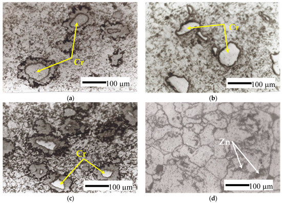 The microstructure of Al-based alloys, which is subjected to heat treatment temperature of 500 °C for 60 min followed by quenching in water at room temperature, is shown in Figure 3. On the other hand, the microstructure of Al-based alloys subjected to extrusion, with an extrusion ratio of 4.6 and solution heat treatment temperature of 500 °C for 60 min followed by quenching in water at room temperature, is shown in Figure 4. The uniform distributions of the Cr and Zn in the homogenous structures were noticed in alloys with Al-based alloys. In addition, it should be reported that surface cracks in the Al-based alloys were very limited. From Figure 3 it is clear that the cold compaction followed by heat treatment technique yielded homogenous microstructure with few pores. In the other hand, the Cr contents in the Al-Zn-Cr ternary system were investigated in Al-20Zn-5Cr and Al-20Zn-10Cr extruded alloys. It is noticed in the micrographs of the extruded billet with heat treatment shown in Figure 4a–f that a fine dispersion of precipitates occurs on the grain surface. In addition, multi-phases were observed in the microstructure in the as-extruded sample, as shown in Figure 4e,f.
