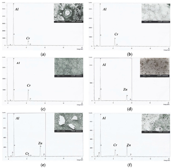After the fabrication process, a Jeol 5400 SEM unit with a link energy dispersive X-ray spectroscopy (EDS) detector (Jeol, Peobody, MA, USA) is attached to observe the particle morphology, size, shape, and agglomeration. The EDX analysis emphasizes this behavior, as shown in Figure 5. The magnified image attached to Figure 5e,f shows that a white large phase was being embedded in a matrix of Al-Zn, as seen from EDX analysis region. The small white phases were mainly Zn particles. After the heat treatment process mentioned above, more homogeneous structure was obtained. The magnified image attached to Figure 5f shows white and dark areas, and the analysis of these areas was given as in EDX analysis region. It can be observed that the white area was Cr rich while the dark was mainly Zn. Figure 3e,f shows micrographs of Al-20Zn-5Cr and Al-20Zn-10Cr alloys, respectively, with heat treatment for one hour followed by water quenching. The liquid Zn during heating indicates homogenous structure, as the Cr particles become smaller than before heating. It shows that the nucleus was enriched with the addition of Cr. The data from EDS spectrum shows that the nature of nucleus was facilitated, as the foreign particle displays a small lattice mismatch in the al-based alloys. The results of calculation for some possible crystallographic orientations on the Cr particles shows that the planar disregistry was low; therefore, Cr can act as the heterogeneous nucleation for Al-based alloys.