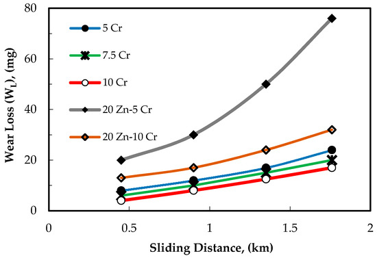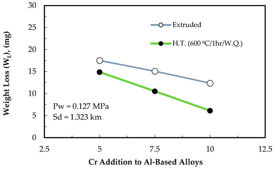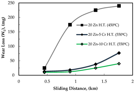 The microstructure shown in Figure 3a indicates that heat treatment of the binary Al-Cr alloys led to a diffusion of aluminum in the Cr particles, resulting in gradual alloying of the Cr particle. It is possible that some Cr particles were dissolved in Al-based alloys, which resulted in alloy hardening and; consequently, an increase in the wear resistance. In the ternary alloys of Al-Zn-Cr, the addition of Zn increases the weight loss for the alloys containing 5 or 10 wt. % Cr, as shown in Figure 7. This effect was clearer for the alloys containing 5 wt. % Cr. The weight loss of these alloys was about 2 times higher compared to the 10 wt. % Cr ternary alloys. In the as-extruded condition, the addition of Zn to the Al-Cr alloys resulted in a higher degree of homogeneity in the microstructure, as shown in Figure 3e,f; however, Cr is a hard metal and is expected to improve wear resistance.