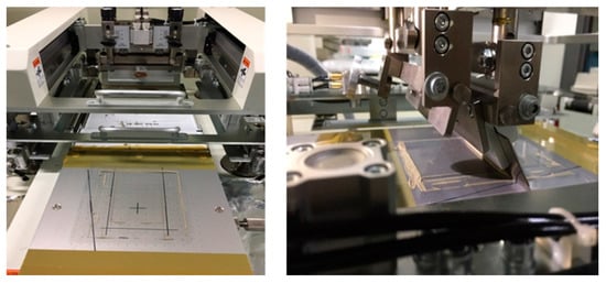 The Ag/Cu@Ag nanoparticle paste was filled into the engraved trench layers consisting of sensor and bezel electrodes on the PET substrate film by using a doctoring machine made by Mino Co. [11] (Gifu, Japan), as shown in Figure 3. The formulations of the photosensitive UV resins are shown in Table 1. Of these UV resins, sample UVT-5-1 was found to give adequate flexibility and demolding property from the metal mold after UV exposure. After filling Ag/Cu@Ag nanoparticle paste into the engraved trench layer, the residual paste was wiped off the embossed part of PET film substrate by a wiping cloth, followed by post-heating of the filled silver paste.