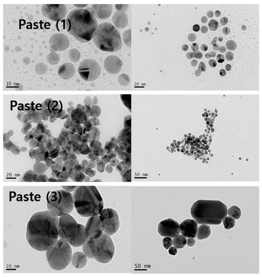 Scanning electron microscope (SEM) images of the synthesized Ag nanoparticles are shown in Figure 5. Ag powder in paste (1) exhibited nanoparticles in the 1–25 nm range, which can promote sintering at lower temperature. Ag powder in paste (2) exhibited the aggregation of Ag nanoparticles, and the Ag powder in paste (3) contained large Ag nanoparticles. The three Ag pastes were formulated with different Ag nanoparticles, and their conductivities were checked after coating and thermal curing on PET substrate films. Table 2 indicates that the Ag paste in paste (1) cured at 180 °C for 20 min showed high conductivity. This may be due to the partial sintering of Ag nanoparticles in Ag paste (1) and concurrent high packing density of Ag nanoparticles, thus promoting effective percolation.