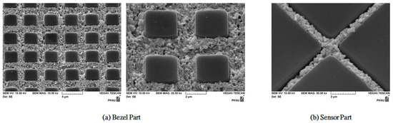 Touch sensor panel and scanning electron microscope (SEM) images of engraved (a) bezel electrodes and (b) sensor electrode patterns made by UV imprinting process with embossed metal mold.