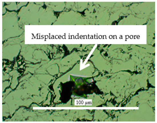 Optical microscopic image of a misplaced microindentation trace on a pore.