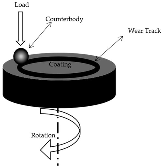Prior to the sliding tests, the specimens were mounted in an epoxy resin and then polished to obtain a surface roughness (Ra) of about 0.8. Dry sliding wear tests (ball-on-disc) were carried in air at room temperature according to ASTM G99–05. The ball-on-disk tribometer is schematically shown in Figure 2. A 6.33 mm diameter alumina ball was used as the counterpart sliding against the coating surface. In ball-on-disk tests, it is preferable to use a harder ball than the coating in order to induce more wear on the coating rather than on the ball. Al2O3 balls with a Vickers hardness of 1700 were used in this study. Each test was conducted with a new ball in order to retain uniform test conditions. A constant load of 5 N, a sliding speed of 0.1 m·s−1 and a sliding distance of 1000 m were used during the tests. The cross-sectional worn area of the wear tracks was measured with a Dektak–150 surface profilometer (Bruker Corporation, San Jose, CA, USA) in order to calculate the worn volume. Finally, the wear rate was calculated as: