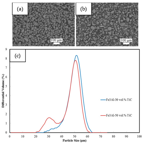 Figure 3 shows the SEM images of the Fe3Al–TiC milled composite powders. The particles have irregular shape, which is common for powders processed with high-energy ball milling. The particle size distribution profile of the milled powders (Figure 3c) shows a bimodal particle size distribution with two peaks at around 30 and 55 μm. The sample with 50 vol. % TiC shows a more pronounced peak at small sizes, which is due to the higher ceramic volume fraction, making the composite more fragile. Despite having a bimodal size distribution and irregular shape feedstock powder, this morphology and size enabled easy supply and good flow of the feedstock powder to the HVOF gun during the spraying process.