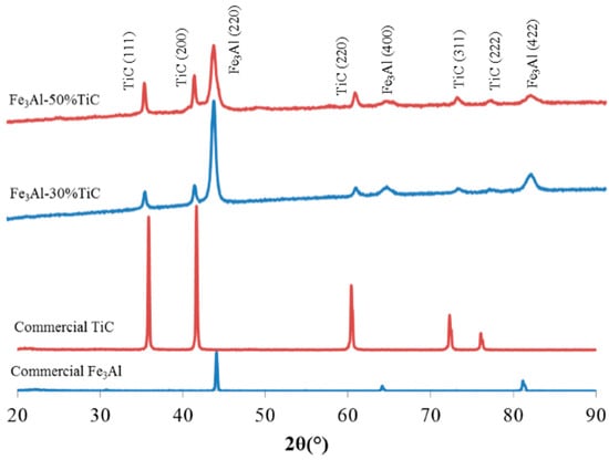 Starting materials in powder form (Fe3Al (<100 µm); Ametek Ltd., Eighty Four, PA, USA and TiC (<5 µm); Alfa Aesar, Ward Hill, MA, USA) were milled together for 3 h, using a high-energy ball mill (Zoz GmbH, Wenden, Germany). Two of the contents of retained TiC were chosen: 30 and 50 vol. %. The weight ratio of ball-to-powder was chosen to be 10:1 and the milling process was carried out in an argon atmosphere in order to prevent oxidation.