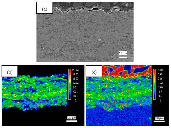 Figure 5a shows the typical microstructure from the polished surface of a coating obtained by Fe3Al–50 vol. % TiC feedstock. The coating consists of relatively dense (porosity <5%, measured by image analyzing method) and homogenous lamellar microstructure which seems to be well-bonded to the steel substrate. The thickness is around 80 µm. Figure 5b,c show the elemental distribution of titanium and carbon, respectively, in the coating. The images reveal that the reinforcing TiC particles are fairly well distributed throughout the microstructure of the coatings. The size of the TiC particles are less than 5 µm, as expected from the initial size of the TiC particles in the milled powder.