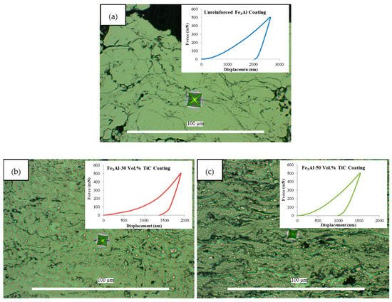 Microindentation images and load-displacement curves of (a) unreinforced Fe3Al, (b) Fe3Al–30 vol. % TiC and (c) Fe3Al–30 vol. % TiC.