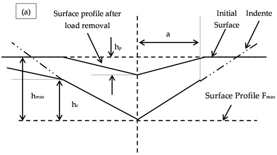 where Fmax is the maximum load, A is the contact area after the indentation and β is a constant which depends on the geometry of the indenter (1.012 for a square shape trace [11]). The effective modulus, which accounts for the fact that during the indentation, elastic deformation occurs in both the indenter and the specimen, is given by Equation (4),
