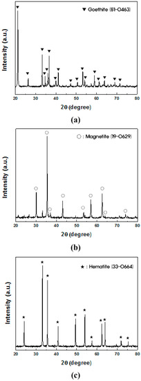 - Cornell, R.M.; Schwertmann, U. The Iron Oxides: Structure, Properties, Reactions, Occurrences and Uses, 2nd ed.; WILEY-VCH: Weinheim, Germany, 2003; pp. 95–109, 201–217. [Google Scholar]
