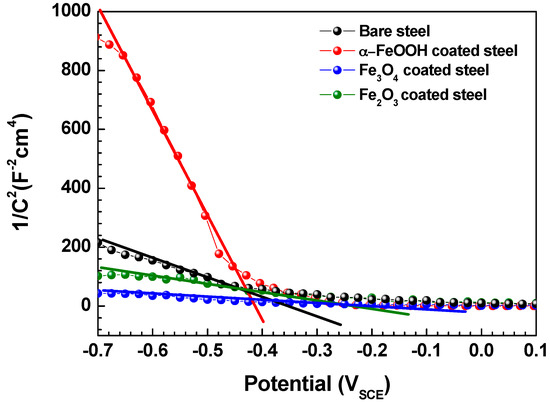 - Azumi, K.; Ohtsuka, T.; Sato, N. Mott-Schottky plot of the passive film formed on iron in neutral borate and phosphate solutions. J. Electrochem. Soc. 1987, 134, 1352–1357. [Google Scholar] [CrossRef]