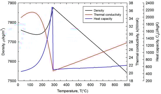 Figure 1 shows an abrupt change of properties at temperature of martensite start, Ms = 288 °C. Density decreases, while thermal conductivity and heat capacity increase. This later property includes the latent heat of solid-phase transformation from austenite to martensite.