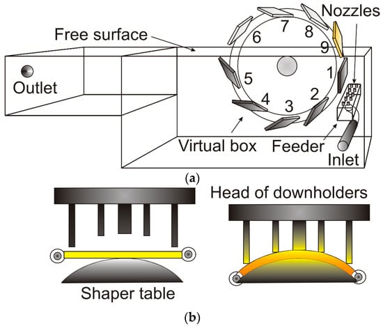 The study case was an oil quenching tank with a carousel provided with tools to shape and hold steel leaf springs, 17 mm thick, 120 mm length and 75 mm wide, while they are immersed in the oil, as shown schematically in Figure 2a. In preparation for quenching, two preheated straight leaf springs are manually accommodated in a shaper table at position 9 of the carousel. A head of downholders then descends over the leaf springs, holding them against the shaper table, as shown in the drawings of Figure 2b. The carousel rotates and submerges the springs in the oil, stopping at position number 1. The operator charges another two leaf springs at position 9 and repeats the process. There are five carousel positions immersed in the oil; see numbers 1 to 5 in Figure 2a. When the leaf springs reach the sixth one, the head of downholders releases the shaped springs, and a robot arm takes them out to a transporting band. The dimensional specifications of the quenching system are given in Table 4. A constant oil flowrate enters through the feeder tube and then flows through two rows of nozzles to generate immersed jets that feed the tank. The oil flows out from the tank to a cooling tower, which prevents it from overheating. When this tank increased the productivity of automotive leaf springs, an unacceptable distortion of the product was found.