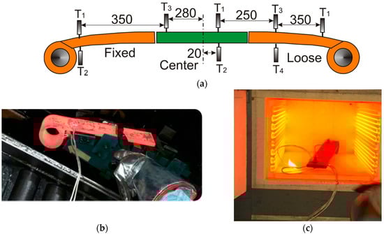 The first step in this approach was to characterize the thermal behavior of the leaf spring during its quenching. Figure 3a schematically shows a drawing of a leaf spring that was cut into three parts: fixed, loose and center sections. They were instrumented by screwing K-type thermocouples to the surface of the leaf in the indicated points. The tip of the thermocouple was hold against the surface of the spring. An instrumented whole leaf spring had an important drawback when manually removing it from the furnace to the carousel. The thermocouple wires delayed this operation, and the leaf temperature dropped excessively before the section was immersed in the oil. In contrast, the smaller sections were heated in a portable muffle and easily moved to the carousel. Figure 3b shows a photograph during accommodation of the preheated and instrumented fixed section onto the shaper table. Figure 3c is a photograph captured during the preheating of the instrumented loose section in a muffle.